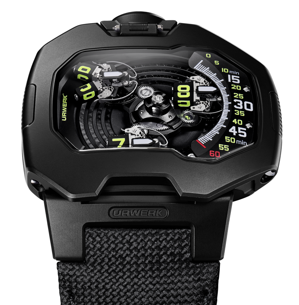 Urwerk ha presentato oggi 21 Giugno il suo UR-120 Space Black, nel quale la tecnologia orologiera ha saputo unire i colori del cosmo (nero profondo) e quelli chiari del cielo, realizzando un segnatempo dalle dimensioni ideali (mm 47 x mm 44, spessore mm 15,8) con la cassa in titanio sabbiato e lunetta in acciaio sabbiato con trattatamento DLC nero; la parte superiore della cassa perfettamente liscia senza alcuna vite che ne interrompa l’estetica.