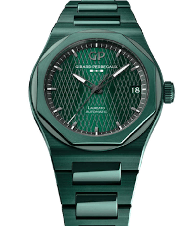 Il verde sembra essere diventato quest’anno, uno dei colori preferiti non solo per i quadranti, ma anche per la produzione di casse e bracciali in ceramica. Lo testimoniano le due edizioni del Laureato automatico, realizzate da Girard Perregaux per Aston Martin in ceramica verde lucida e satinata. Il colore richiama quello legato alla nazione britannica, mentre la trama del quadrante retinato lavorato a soleil è ispirata al motivo a losanga del logo ‘AM’ (1921-1926) che appare anche sui sedili trapuntati di alcune delle auto ad alte prestazioni.