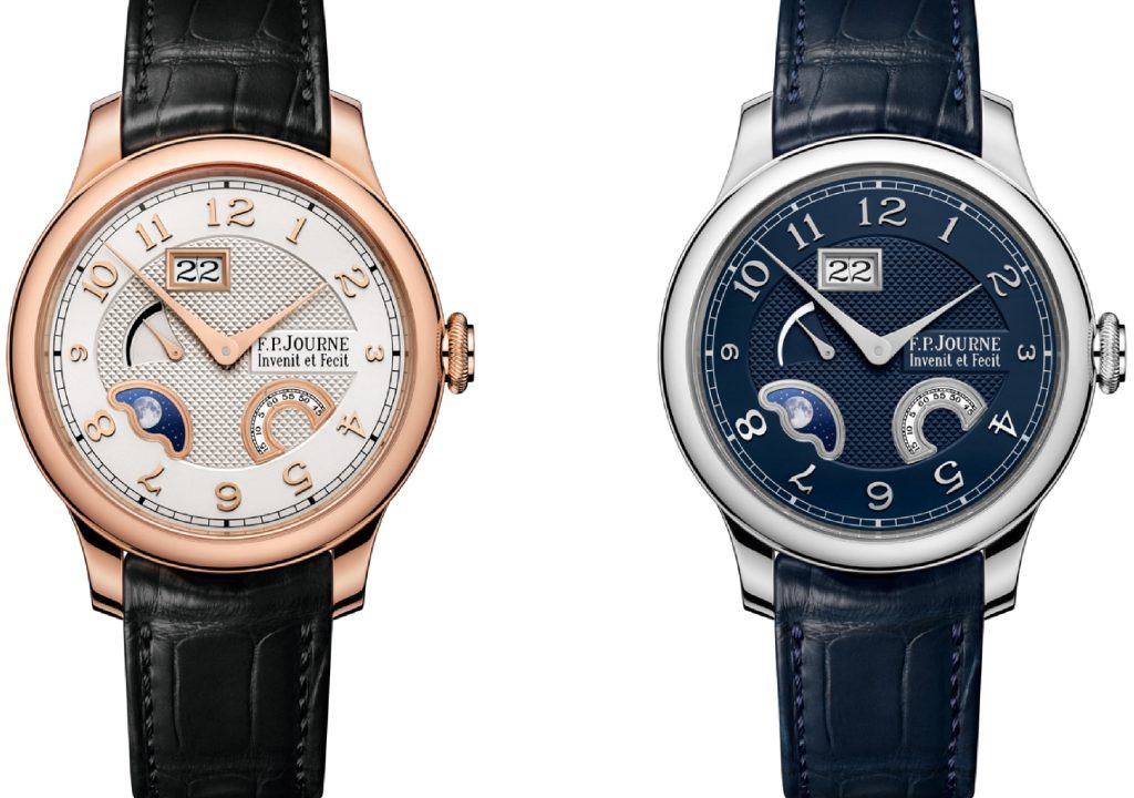 Il sistema di carica utilizza cuscinetti a sfera autobloccanti e ogni minimo movimento del polso viene sfruttato al massimo; il bilanciere è a inerzia variabile; sul quadrante d’argento opaco o blu intenso (per la Boutique Edition) il centro è lavorato a guillochage, la data a scatto istantaneo appare in ampie finestrelle, alle 10 c’è l’indicazione della riserva di carica e in pendant, nella parte bassa del quadrante, i piccoli secondi su disco e le fasi di luna su vetro zaffiro, regolabili dalla corona; gli indici d’oro in cifre arabe sono applicati e sono in oro anche le cornici delle indicazioni. Le finiture sono quelle dell’Alta Orologeria. Come sempre sul quadrante appare il motto scelto dal Maestro francese: F.P.Journe Invenit et Fecit.