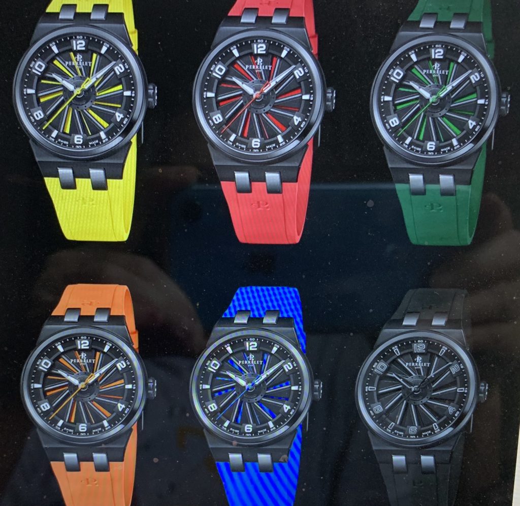 Le nuove dieci referenze che vedremo durante il prossimo G.W.D.; quattro con la cassa in titanio e il sotto quadrante blu, verde, rosso o nero con le 12 pale in alluminio anodizzato, sotto alle quali si trovano 5 contrappesi in tungsteno. Una novità è rappresentata dalle lancette a daga rivestite con materiale luminescente e sottolineate da un profilo nero e da un segmento orizzontale, che ne suddivide la superficie fra la base e la parte terminale.