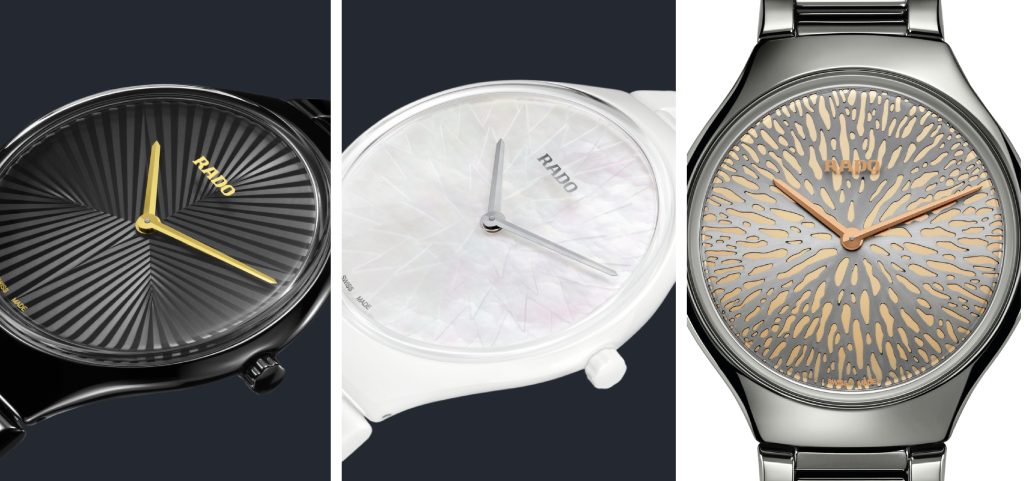 Il primo segnatempo con cassa nera lucida, vetro zaffiro anche sul fondo, quadrante dalle misteriose volute con il logo Rado metallizzato, custodisce il movimento automatico premium Rado R766, impiegato anche negli altri due orologi, con una riserva di carica di 64 ore e spirale antimagnetica Nivachron TM. Il secondo con la cassa in ceramica bianca high-tech sul quadrante in madreperla mostra un disegno che ricorda le foglie dell’Araucaria. Il terzo ha la cassa e la corona in ceramica high-tech plasma lucida, sul quadrante a due strati (quello superiore scheletrato color rodio spazzolato soleil è decorato con una struttura stilizzata che ricorda i rami dell’Albero del drago, quello inferiore è color oro rosa con il logo Rado metallizzato.