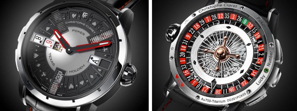 Nel Poker il movimento, ha una carica di tre giorni e comprende le 52 carte da gioco, seguendo le regole del poker per tre giocatori più il banco. Premendo il pulsante a ore 9 parte un congegno che aziona 4 dischi concentrici (uno è in vetro zaffiro) sui quali compaiono le carte. Quando il moto si ferma le tre carte scelte da questo algoritmo orologiero sono nelle finestrelle alle 6, alle 10,30 e alle 2,30, ma invisibili agli altri giocatori perchè celate da persiane orientabili. Premendo il pulsante alle 8 appare, sulla destra del quadrante, la quarta carta e poi l’ultima. Ogni volta che si preme il pulsante si sente una melodia. Le lancette sul quadrante sono in rubini, spinelli o in titanio nero, le ore si vedono sulla lunetta. Per buona misura sul retro di questo orologio c’è la roulette. Quando la massa oscillante si ferma una lancetta indica il numero vincente. I 37 numeri, in nero sono sul réhaut esterno, quello scelto dal giocatore è indicato sotto uno smeraldo verde, incastonato sul fondo, che si sposta solo con una chiave speciale per garantire la scelta vincente. Quattro le versioni: con cassa bicolore (in titanio grado 5 PVD nero e oro bianco o titanio grado 5 PVD nero e oro rosa) oppure monocromatica in titanio grado 5 naturale o trattato PVD nero; ognuna composta da 20 esemplari. Un’altra versione è stata dedicata al Poker come lo si gioca in Texas e in questa, soffiando sul vetro, appare una pin-up.