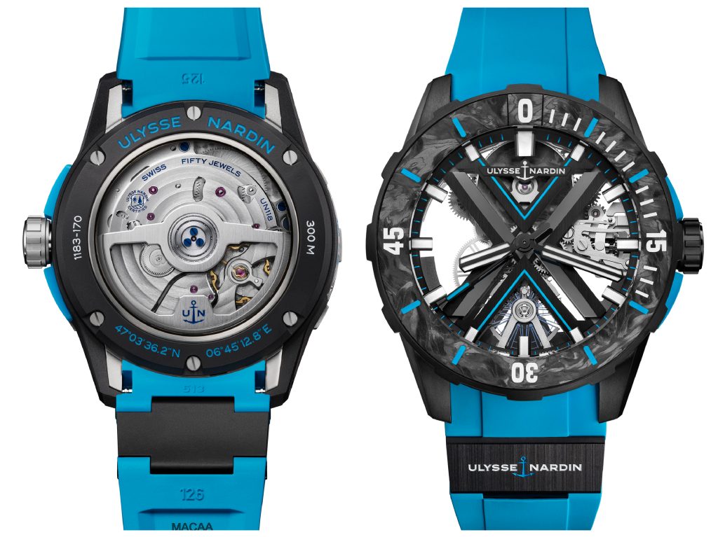 Il nuovo Diver X Skeleton, ref.723-170-2B/3A accoglie nella cassa in titanio trattata DLC ø 44 mm con fondo a vista in titanio nero DLC, il movimento automatico di Manifattura Calibro UN-372 (bilanciere extralarge in silicio, così come sono in silicio la ruota scappamento, l’ancora e la spirale; le A/h sono 21.699 e 23 i rubini); la lunetta girevole unidirezionale concava è in Carbonium® con vetro zaffiro bombato; quadrante scheletrato con X in PVD nero lucido e satinato, copribariletto in Carbonium®;Indici e lancette nere con Super-LumiNova; cinturino in caucciù azzurro con elemento “Ulysse Nardin” in ceramica nera a ore 6 compatibile con R-STRAP, fibbia ad ardiglione in ceramica nera e titanio PVD nero.