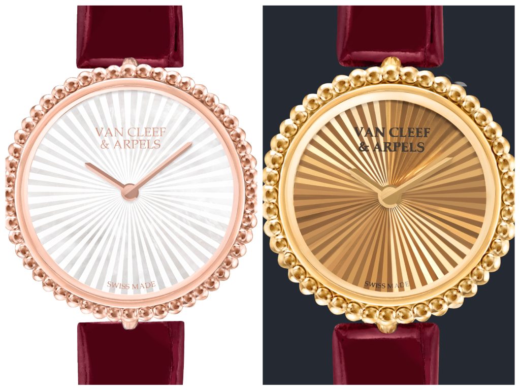 Ispirato alla collezione Toi e moi con i due gioielli che si guardano, questo nuovo bracciale in oro estremamente flessibile, per la prima volta presenta da un lato l’orologio segreto da vedere ruotando il coperchio e dall’altro una pietra (corniola, turchese, malachite) contornata dalle perle d’oro e anche incastonata con diamanti. Due le dimensioni, piccola e media. Le perle sono state spesso impiegate nei gioielli di VC&A sin dagli anni dell’Art Deco, quelle realizzate in oro sono nate negli anni ’60, anche se, negli archivi della Maison c’è il disegno di un orologio in oro con bracciale analogo, contornato da perle d’oro, che risale alla fine degli anni ’40.