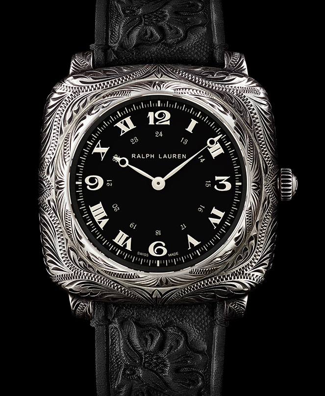 RALPH LAUREN: per festeggiare il suo 50° anniversario RL si ispira al mitico West con cinturini in pelle realizzati artigianalmente in Texas e poi rifiniti in Italia mentre la cassa ø 42 mm in acciaio inossidabile e le fibbie sono di fattura newyorchese, infine il movimento automatico RL514 è realizzato espressamente da Piaget per RL (i rubini presenti sono 26 e la riserva di carica è di 40 h.). Sotto il profilo estetico il quadrante nero e gli indici in cifre arabe o romane nonché la visibilità delle lancette stile Breguet, rendono estremamente attuale questo orologio che, nel prossimo novembre, attirerà a New York l’attenzione degli appassionati americani,