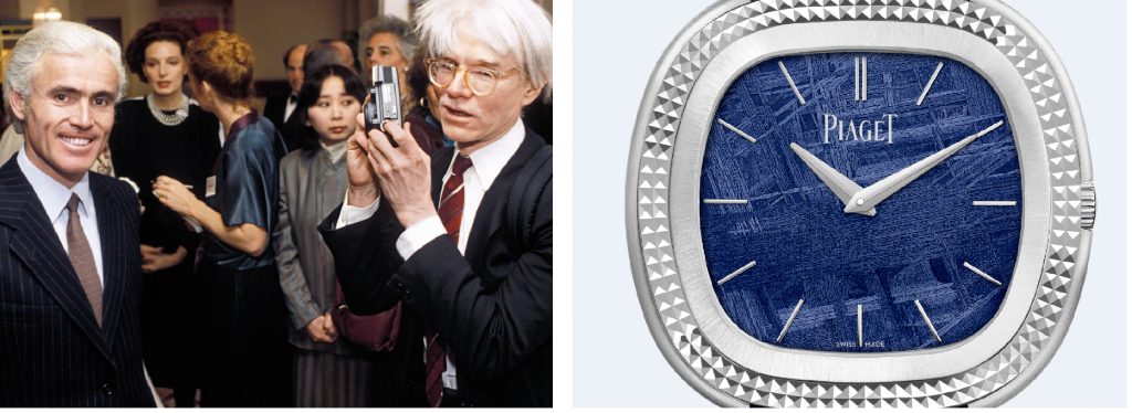 PIAGET: Infine ci occupiamo ancora di Piaget o meglio del suo 150° anniversario per pubblicare una foto del secolo scorso che mostra Yves Piaget con Andy Warhole, ricordando la definizione che il primo diede all’opale, presente in molti orologi gioiello della Maison; eccola: “C’è una pietra che cattura perfettamente la ricchezza del pianeta Terra: l’opale. Gli opali sono costituiti da cristalli che differiscono in termini di struttura fisica e composizione chimica. Nonostante le loro diverse proprietà, i cristalli comunicano tra loro, cementati insieme nella stessa pietra. Per me il mondo secondo Piaget è come un opale.” Tornando ai giorni nostri secondo noi l’orologio scelto al termine del 2024, anno che ha festeggiato il 150° anniversario della Maison, non poteva che essere l’attuale riedizione dell’orologio amato da Andy Warhole con cassa lavorata a Clous de Paris e quadrante in meteorite blu. Il modello rientra in quella mitica Piaget Society ideata da Yves Piaget che nel secolo scorso era riuscito a unire VIP di mondi diversi ma legati dalla passione per gli orologi e per lo stile Piaget.