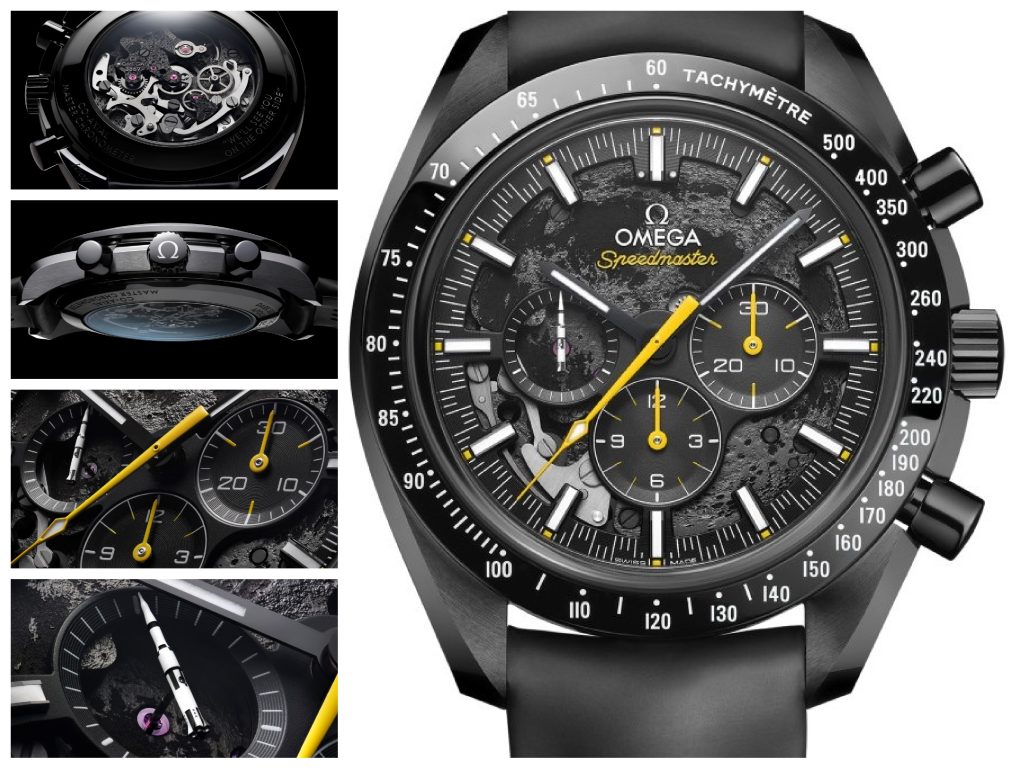 Tutti ricordiamo l’allunaggio di Louis Armstrong, così come la frase “Houton abbiamo un problema”, non altrettanto noto il messaggio lanciato da Apollo 8 comandato da Jim Lovel (primo nel 1968 ad orbitare intorno alla luna) che dava appuntamento a Houston “dall’altra parte della luna”; quel Dark Side, o lato oscuro, che non vediamo dalla terra ma che è visto dagli astronauti. ll nuovo Dark Moon Side Omega mostra sul quadrante scheletrato in alluminio anodizzato nero e sul retro del cronografo, la realtà della superficie lunare servendosi dell’ablazione al laser con incisioni su superfici a contrasto.