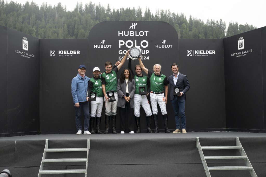 Nella foto ufficiale Max Charlton, Nacho Gonzales, Philipp Muelle e Jaime Robert, componenti della squadra Kielder che ha vinto il torneo; tutti sono stati premiati con un orologio Hublot, un Big Bang Original Steel Ceramic che reca l’incisione «Hublot Polo Gold Cup Gstaad Winner»; il movimento del cronografo, MHUB4100, è un calibro di Manifattura a carica automatica con 42 ore di funzionamento.