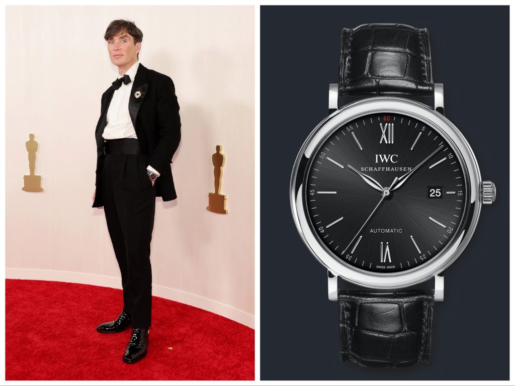 L’irlandese Ciilian Murphy, premiato come miglior attore protagonista in Oppenheimer, durante i parties californiani, ha diviso le sue preferenze tra due iIWC Portofino automatici in acciaio con quadrante nero e uno in oro.