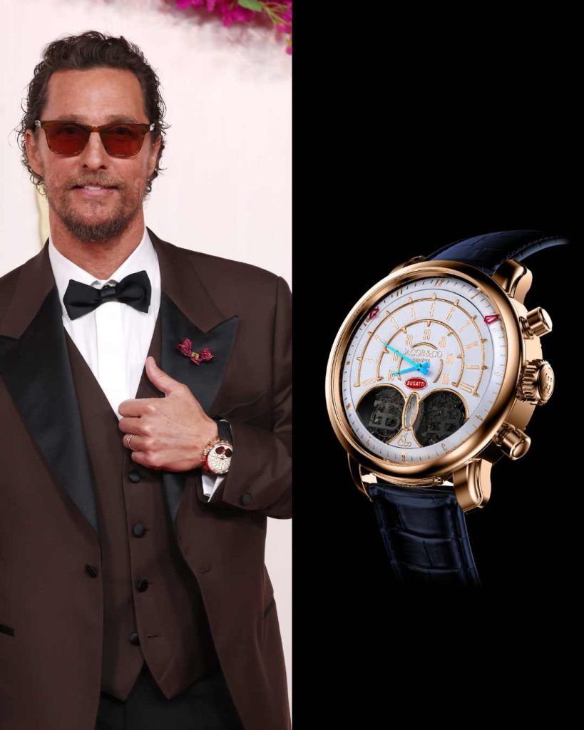 Sul Red Carpet del 10 Marzo l’attore americano Matthew McConaughey aveva al polso il cronografo supercomplicato di Jacob & Co’s disegnato fra Jean Bugatti, figlio del grande Ettore. Sul quadrante di questo modello della collezione Bugatti, le indicazioni cronografiche a doppio retrograde riprendono quelle di un cronografo di bordo sulle automobili. Una volta premuto il pulsante della cronografia la prima lancetta si nuovo da 0 a 10, poi torna indietro e completa la sua corsa; nel frattempo la seconda lancetta che indica i secondi da 00 a 01, dopo 59 secondi raggiunto il 60°, torna indietro allo 0. Ripristinando la cronografia che ha la ruota a colonne e la frizione orizzontale, le due lancette non saltano indietro istantaneamente, ma continuano il loro percorso sino alla posizione finale tornando poi a retrogade allo zero.