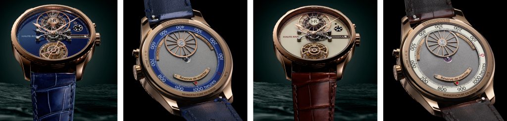 Il movimento è il Calibro HR01. C’è un solo bariletto che si carica ruotando la lunetta con una molla lunga più di tre metri. Il bilanciere è a inerzia variabile, lo scappamento a tourbillon volante ha la gabbia che ruota in un minuto. L’indicazione della riserva di carica appare sul retro; le A/h sono 18.000 e i rubini 35. Legata alla tradizione dell’alta orologeria la finitura di platina e ponti, sabbiati, satinati e smussati artigianalmente.