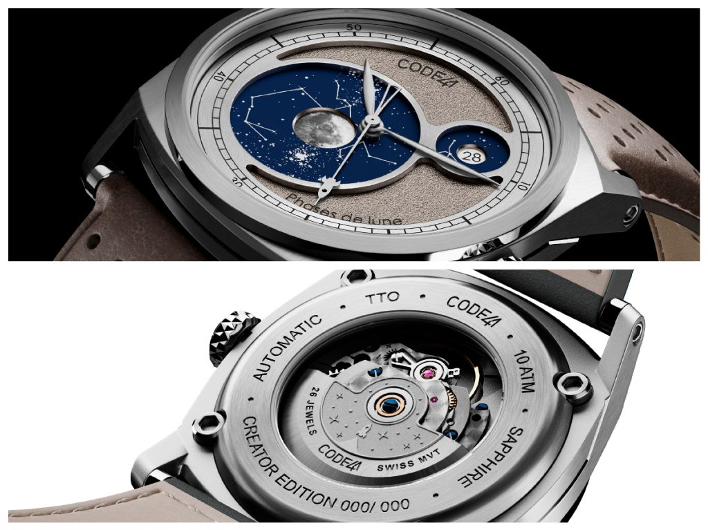 La massa oscillante visibile dal retro può essere personalizzata e un’altra possibilità riguarda l’acquisto dell’orologio con il certificato del COSC (-4+6 secondi al giorno) che incide per una trentina di franchi sul prezzo d’acquisto (CHF 3.295 o altre valute: Euro, Sterline o U.S. dollari). Infine per sedici esperti che lo chiederanno ci sarà la possibilità di montare da soli l’orologio, sotto la supervisione dei maestri di Initium, partner di Code 41. In omaggio alla trasparenza sull’origine dei componenti (uno dei punti chiave del successo di Code 41) cassa, quadrante e confezione sono cinesi, mentre design/RD, movimento, disco della luna, massa oscillante, assemblaggio e logistica sono svizzeri.