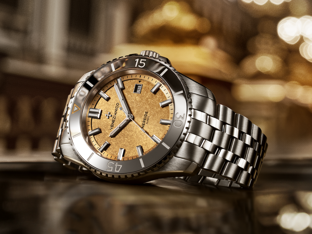 L’opulenza dell’oro negli affreschi delle basiliche (e in particolare nei mosaici di San Marco dove sottilissime foglie di vetro colorato e dorato coprono oltre 8.000 metri quadrati ), i ricchi dipinti nei palazzi sui canali e i sontuosi abiti settecenteschi si ritrovano sul quadrante del più recente Nereide di Venezianico. Un orologio Diver con il bracciale in acciaio che porta una nota classica-sportiva, allo splendore della Serenissima con il disegno, ispirato alla linearità di Jacopo Sansovino.