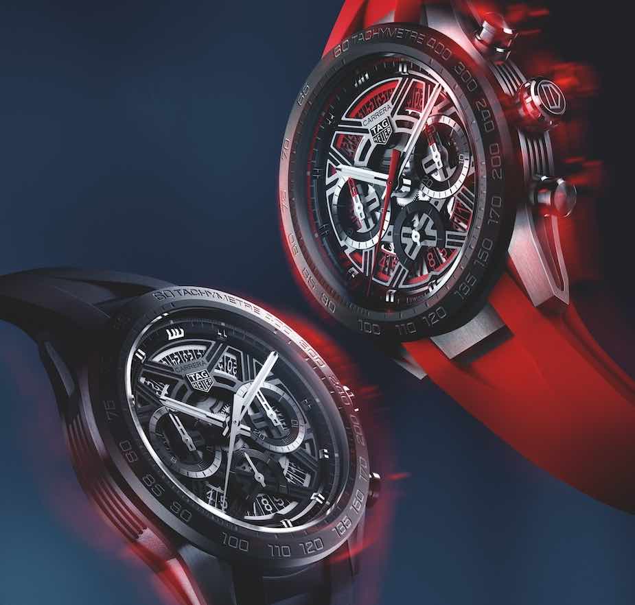 I due cronografi con scappamento a Tourbillon hanno le stesse misure dei primi quattro, variano però i colori e i materiali. Due le varianti: in carbonio nero oppure in oro rosa, rispettivamente con dettagli grigi rodiati o oro rosa sul quadrante. Il movimento di Manifattura a carica automatica e con ruota a colonne è il Calibro TH20-09, riserva di carica 65 h. Infine i Carrera Extreme Sport sono disponibili, come quadranti, anche per il modello Connected Calibro E4 con tecnologia connessa.