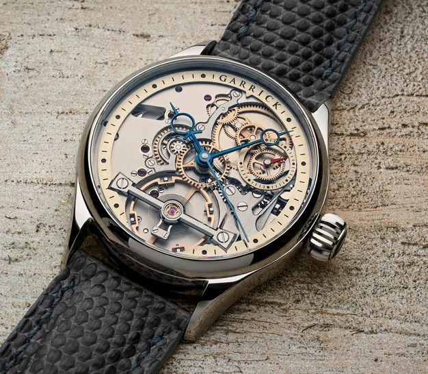 Tra le novità esposte nell’hotel d’Angleterre anche il nuovo S3 Deadbeat Seconds (DBS) realizzato dopo il successo ottenuto dal Deadbeat S2; il nuovo orologio unisce all’indicazione centrale saltante dei piccoli secondi anche quella della riserva di carica. I Deadbeat, cosiddetti secondi morti, si muovono a scatti se il movimento è al quarzo mentre nel Calibro meccanico il movimento è continuo. Nella novità Garrick il movimento meccanico impiegato è il Calibro DB-GO7 costruito in house e affidato per la finitura all’orologiaio Stuart Smith. Sul quadrante “open-worked”, alle 6 la firma di Garrick: il bilanciere che con piccole viti adatta l’oscillatore a diverse dimensioni della cassa consentendo una migliore precisione; i test durano tre giorni e hanno evidenziato uno scarto di + -3 secondi (ricordiamo che il certificato COSC ammette uno scarto tra -4 e+6). Il quadrante “open worked” presenta anche un’altra particolarità, le lancette, sia per la forma sia per il colore possono essere scelte dall’acquirente al quale l’azienda presenta oltre cinque varianti.