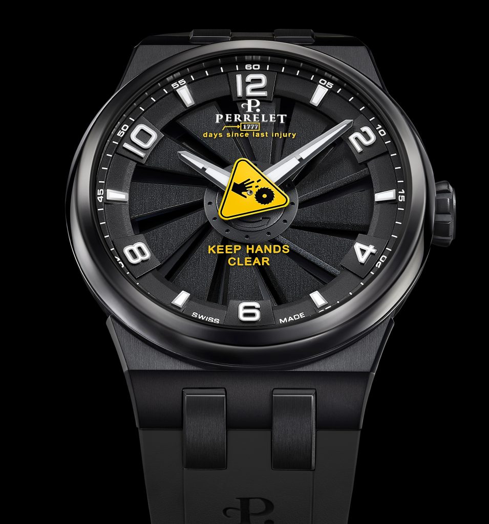 Perrelet nello scorso Dicembre, ha donato all’asta Charity Time for Art, a favore di Swiss Institute, un orologio “unique piece” con il quadrante ideato da un artista e visto il successo ottenuto prosegue su questa strada instaurando una collaborazione con Romanic André. L’artista francese che nel 2017 ha chiamato il suo atelier Seconde/Seconde/. L’ironia di Seconde/Seconde/ non ha scelto ciò che si vede attraverso le pale rotanti, ma altri componenti essenziali dell’orologio. Sulla lancetta centrale dei secondi è posizionato l’avviso “Keep Hands Clear”, segnale stradale che avverte gli automobilisti della presenza di macchinari in movimento o di altri pericolosi intralci; poi l’attenzione dell’artista si è spostata sulla data di fondazione del Marchio (1777 )aggiungendo in inglese “…days since last injury”, parafrasando il cartello “Safety First” che nelle fabbriche anglosassoni indica il numero di giorni senza infortuni a dimostrazione della sicurezza sul lavoro.