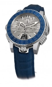 Data di grandi dimensioni e fuso orario, regolabili con la lunetta, sono sincronizzati grazie a ruotismi alloggiati su piani inclinati; il sistema è coperto da brevetto ed è stato ideato dal team di ingegneri della Marca. Inoltre il DateZoner Pilot, nella foto a lato, indica sul cerchio interno della lunetta l’ora solare (ottobre-febbraio) e sul cerchio esterno quella legale (marzo-settembre). La cassa ø mm 48 è in titanio, il quadrante silver, le maxi lancette scheletrate altamente fluorescenti.