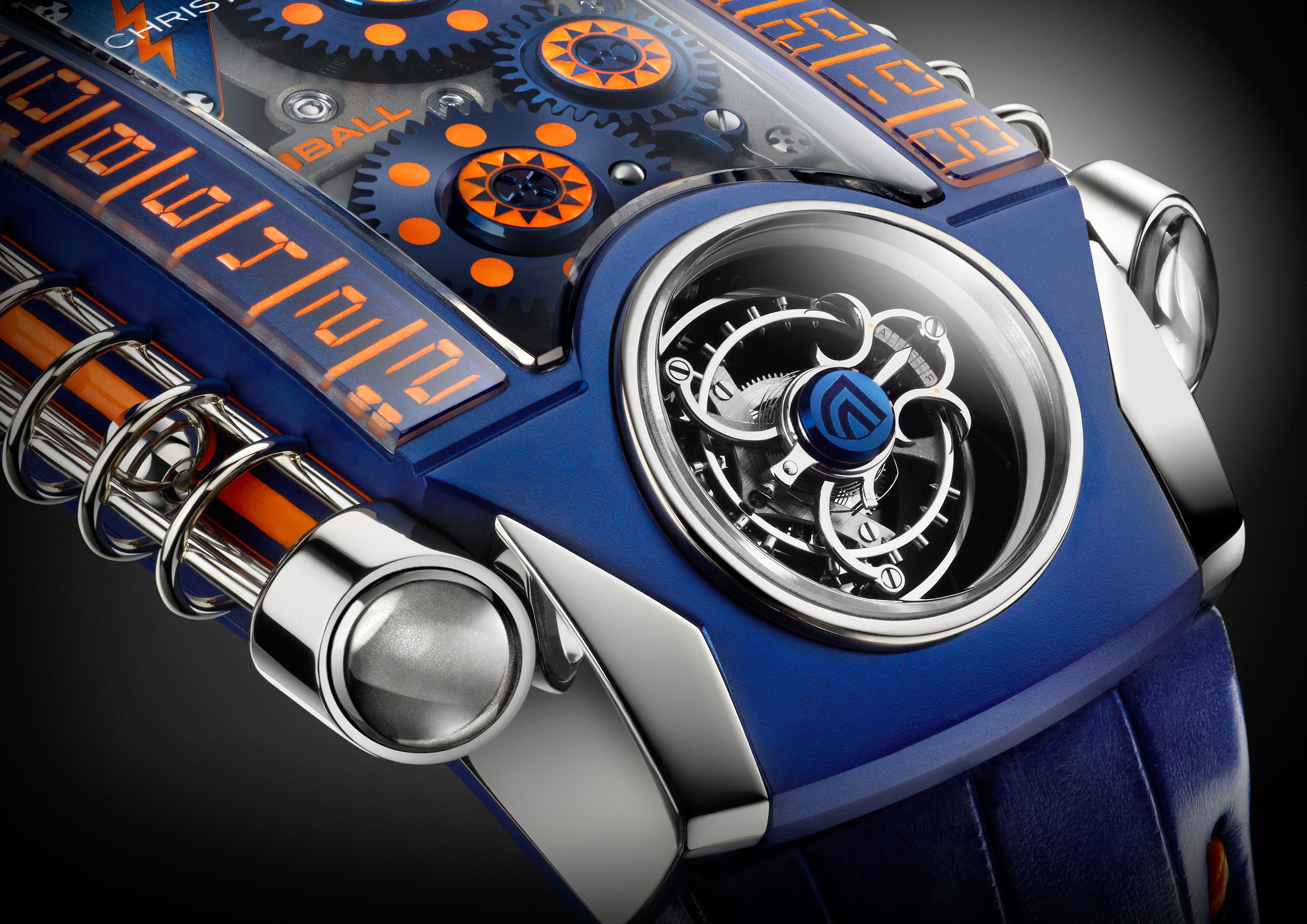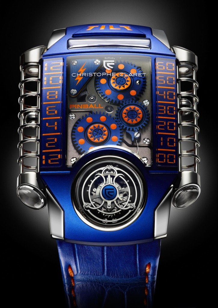 Ideandolo Christophe Claret si è ispirato, per la parte visibile del movimento al flipper, anche per i colori: blu e arancione. Un aspetto ludico perché l’asta di Montecarlo vuole aiutare la ricerca per debellare una delle gravi malattie che colpiscono proprio i bambini, la miopatia di Duchenne.