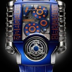 Una sfera all’interno di ogni rocchetto si muove durante la carica cosicché l’orologio sembra animarsi e anche la corona dà l’identica illusione. Infine le dimensioni della cassa: mm 40,80 x 56,90 in oro bianco al palladio e alluminio tipo perunal anodizzato blu.