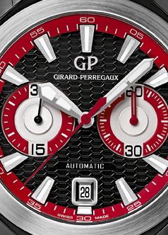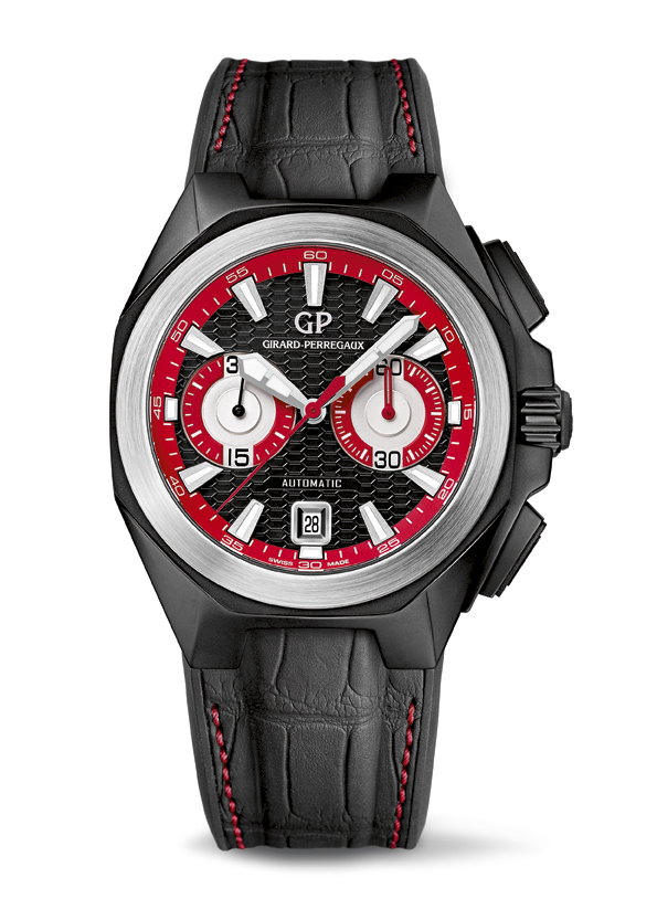 Realizzato in versione unica il Chrono Hawk presenta un’estetica molto particolare: cassa con superfici squadrate in ceramica nera opaca, lunetta perfettamente rotonda in palladio e rehaut rosso, come rossi sono i contorni dei due contatori. Il tutto spicca sul fondo nero del quadrante, che riprende un motivo ispirato al famoso ponte a freccia del tourbillon, che resta l’icona di Girard-Perregaux. Il fondello in vero zaffiro lascia vedere il movimento. Questo è un Calibro 13”’1/2 a carica automatica, il GP03300. Le alternanze ora sono 28800, i rubini 61, l’impermeabilità garantita a 100 metri. A completare un look che unisce sportività ed eleganza, il cinturino in coccodrillo e finitura laterale in caucciù, ha le cuciture rosse. La fibbia pieghevole è in titanio trattato PVD e ceramica.