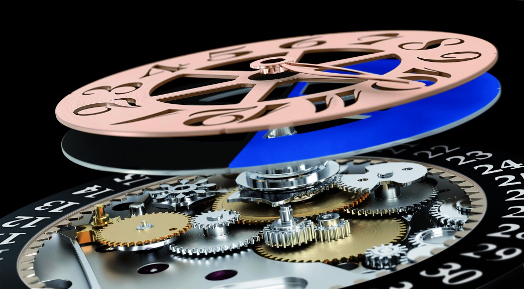 Presentato nello scorso gennaio al SIHH, questo cronografo monopulsante con ruota a colonne e innesto verticale, è dotato di indicazioni ideate dall’Institut de Recherche Minerva guidato dal Maestro Orologiaio Demetrio Cabiddu. Il movimento automatico di Manifattura, visibile dal fondo in vero zaffiro, ha un doppio bariletto; i rubini sono 42, le A/h 28.800. Sul quadrante guilloché a grano d’orzo, ora digitale che integra anche l’indicazione giorno/notte visibile per i due colori dalle cifre traforate, tradizionale anche se decentrata quella per i minuti; i contatori dei 30 minuti e dei piccoli secondi hanno dischi rotanti sotto lancette fisse; alle 6 il ponte rosso rubino a due bracci sembra un sorriso, due finestrelle, a sinistra e a destra, indicano il giorno della settimana e la data.