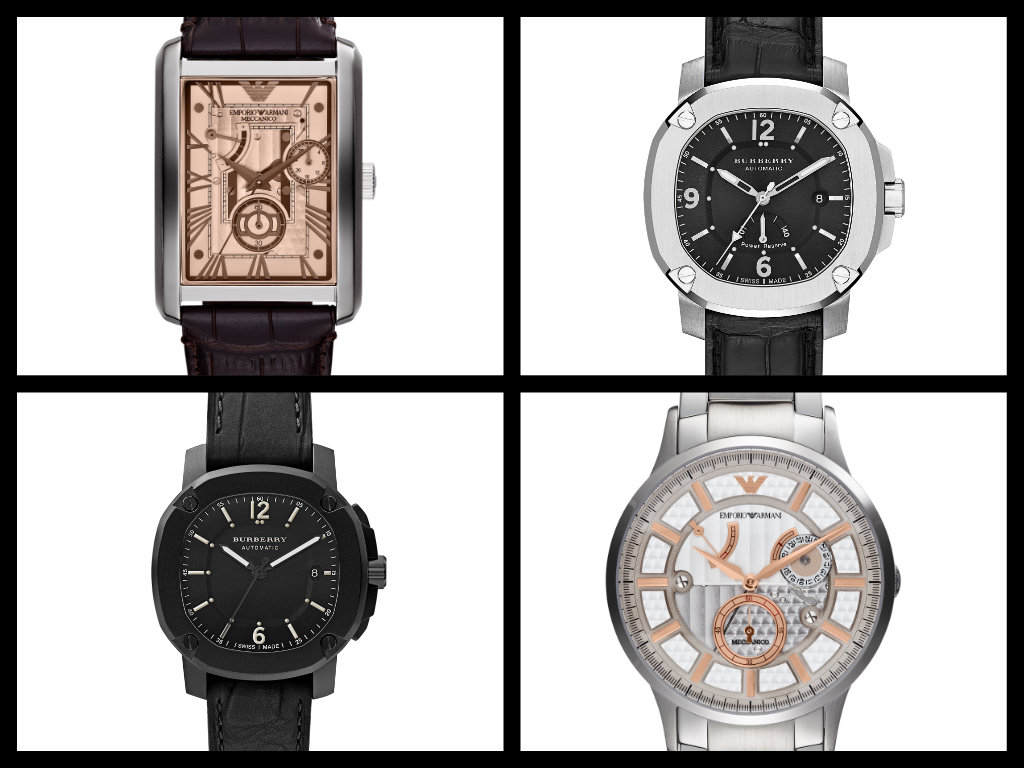 Emporio Armani meccanico con riserva di carica, in alto a sinistra e in basso a destra le referenze AR4243 e AR4663; Burberry The Britain automatici, riserva di carica, in acciaio o black, Ref. BBY 1002 e 1207.