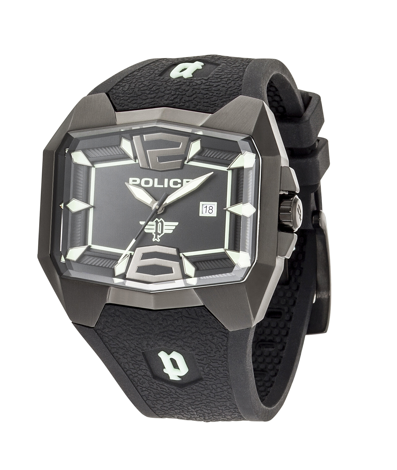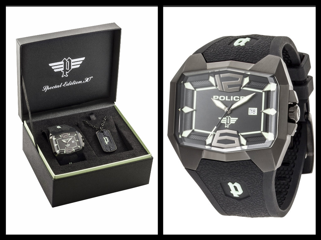 Non è il costo, e quindi l’appartenenza ad una certa fascia di prodotto, a determinare una passione da collezionista o da semplice amatore. Un orologio deve piacere indipendentemente da singole motivazioni come prezzo, tecnica, estetica, è il loro complesso che, secondo me, fa scattare il desiderio di acquistarlo. Dopo questo lungo preambolo auguri per i trent’anni del marchio Police che sta lanciando un’edizione limitata. Nella confezione oltre all’orologio un pendente con il logo sulla piastrina. Con movimento al quarzo e cinturino in gomma l’orologio ha un quadrante che ricorda quelli a TV di una trentina di anni or sono; la cassa è in acciaio, gli indici luminosi più che generosi.