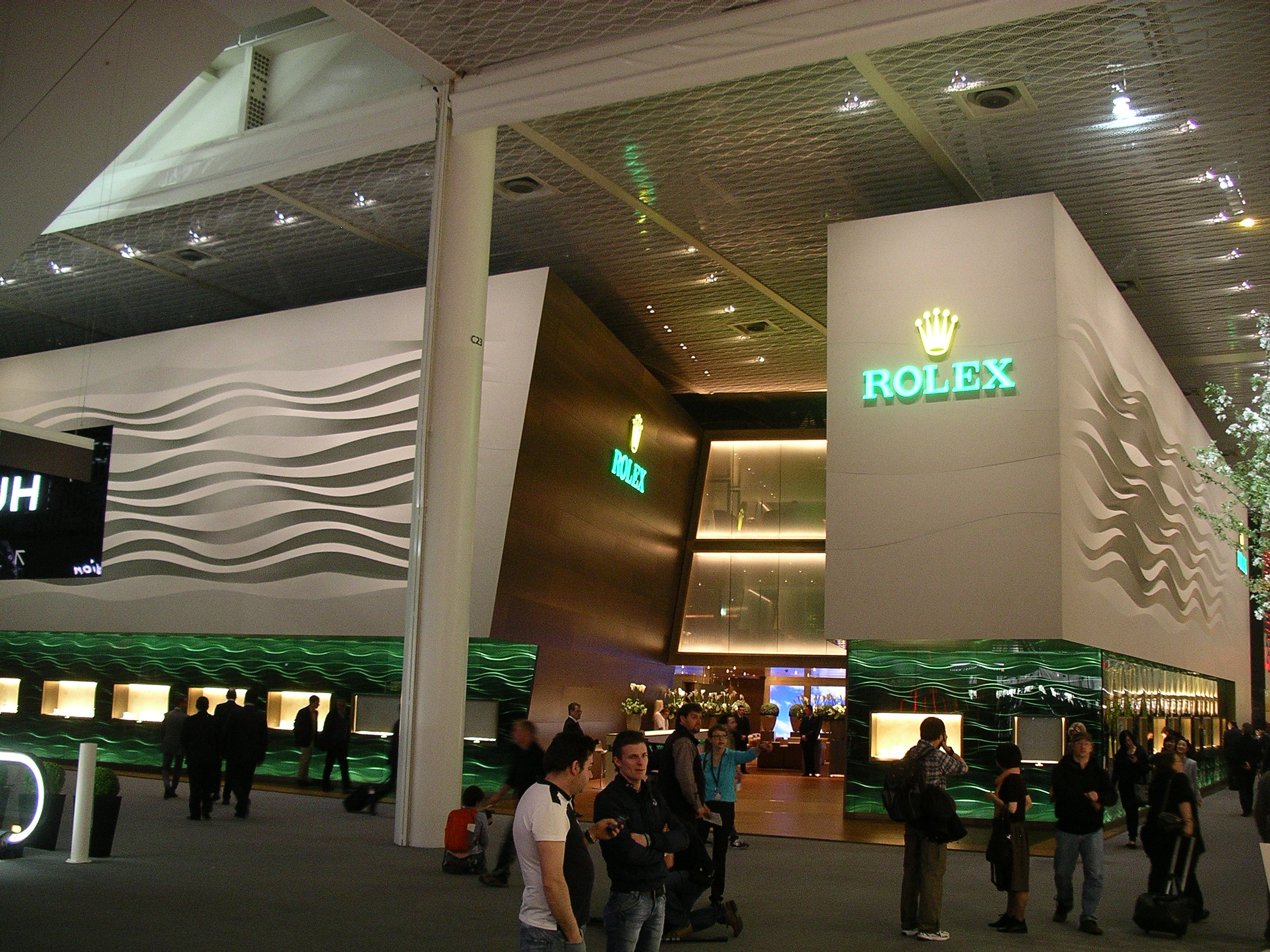 Il 25 aprile ho pubblicato la foto del Daytona in platino (bracciale compreso) e solo accennato al GMT Master II con lunetta in Cerachrom, dove non si vede lo stacco dei colori. Quindi mi sembra giusto pubblicarne la foto e, soprattutto parlare anche delle altre novità a partire dal nuovo stand progettato in house. Con un leit-motiv a onde del mare, anche nel verde della Maison, lo stand copre una superficie di 1.230 mq, misura infatti m. 41x30x9; i tre piani hanno consentito non solo nuovi uffici, ma ampie zone di accoglienza, il bar e persino un ristorante per 40 coperti. Ma torniamo alle novità. L’Oyster Perpetual Day-Date (ø mm 36) in oro giallo, bianco o Everose, per la prima volta ha il cinturino in pelle. Nuovi anche i colori dei suoi quadranti: cioccolato, ciliegia, verde e blu.