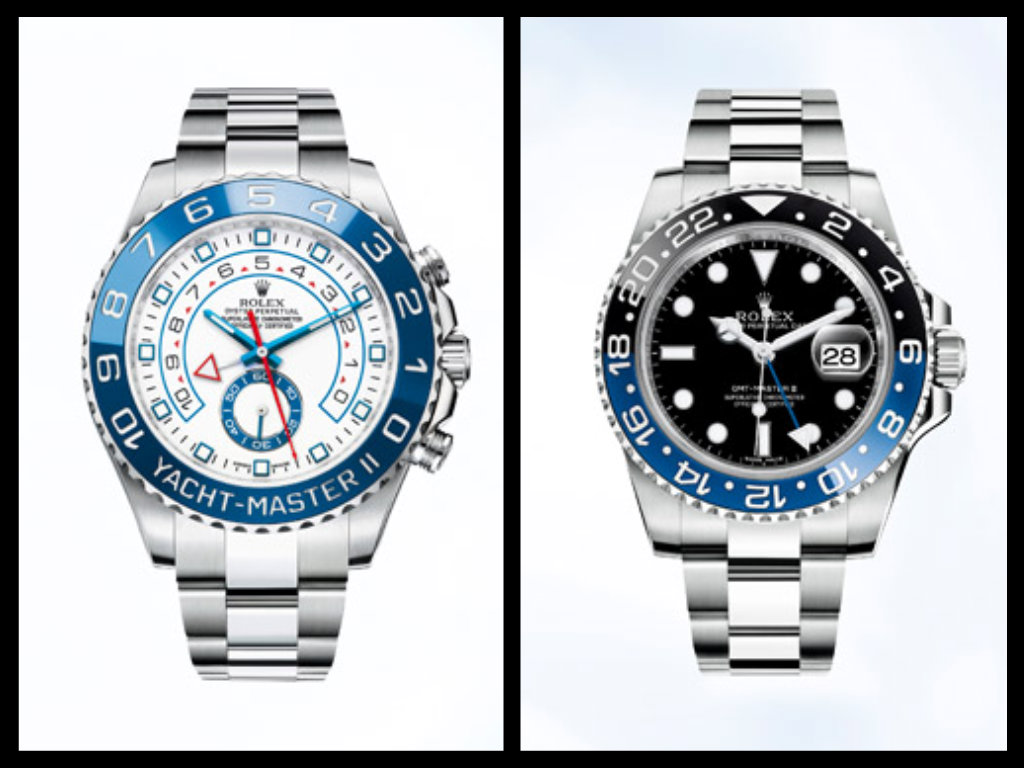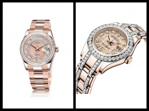Finalmente lo Yacht Master II (cassa mm 44 e particolare count-down per le regate) è stato realizzato in acciaio (foto sopra) con lunetta Cerachrom in blu. Per i polsi femminili (foto sotto) l’Oyster Perpetual Day Date Sertie (ø mm 36) in Everose o oro bianco, con analogo bracciale, ha il quadrante in madreperla e gli indici sono sostituiti dalla decorazione in diamanti; sette le versioni disponibili anche con quadranti in pietre fini in vari colori. Ancora più prezioso il Lady Datejust Pearl Master ø 26 mm, incastona diamanti sulla lunetta e sul bracciale; il quadrante in madreperla nera o bianca è decorato con motivo a fior di loto realizzato con una tecnica esclusiva.