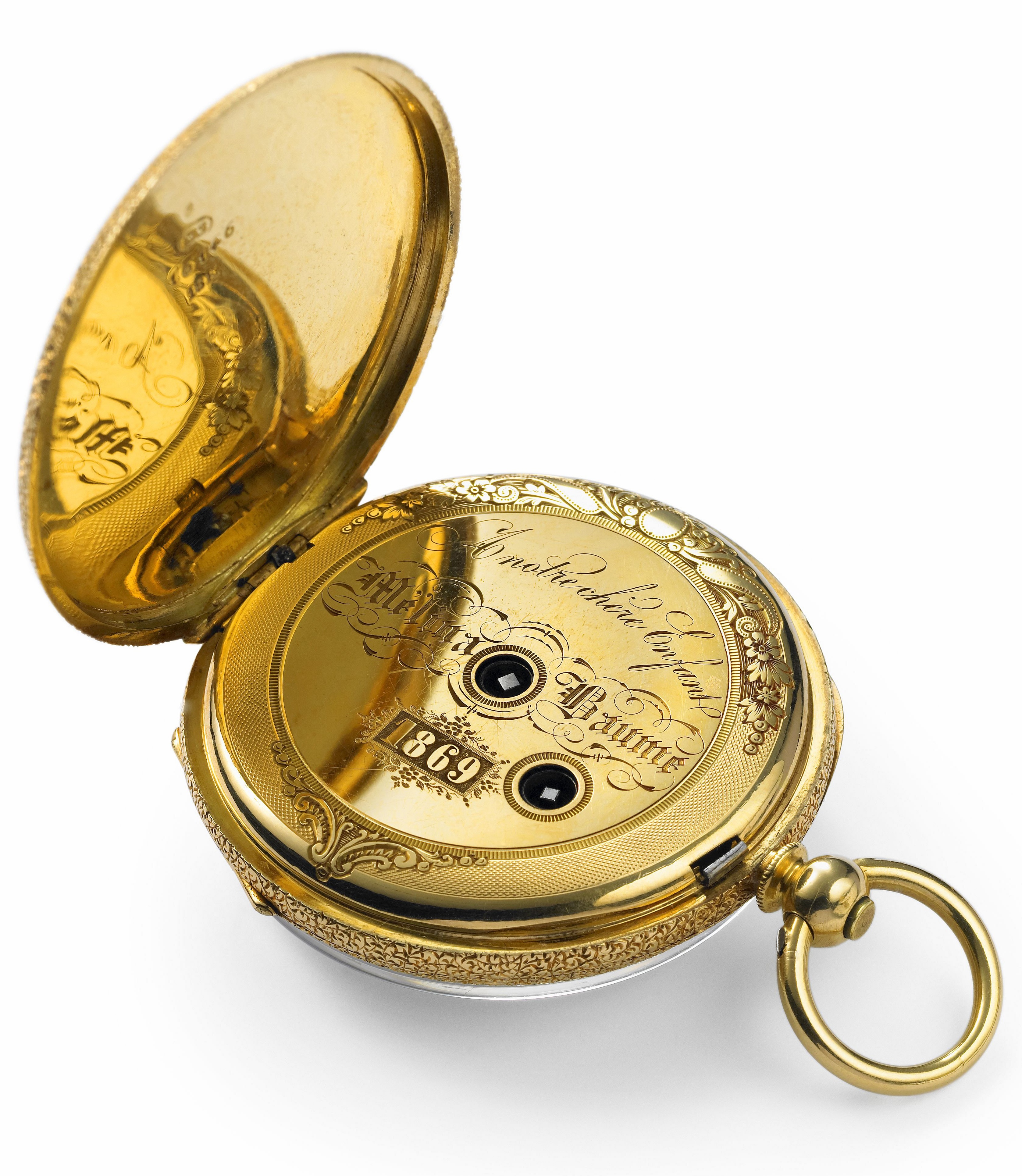 Nel 1869, per la Prima Comunione della figlia Meline, Victor Baume e la moglie le regalano un delizioso orologio d’oro (nella foto sotto) finemente inciso e con una dedica affettuosa.