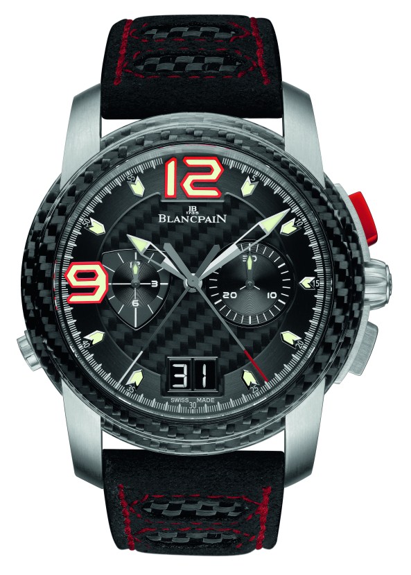 Tornando agli orologi Blancpain, che in questi anni sono stati realizzati non solo per i proprietari delle Lamborghini, ma per chi ha comunque discrete disponibilità economiche, eccone le caratteristiche tecniche. L’E-volution, il più recente, è un cronografo, rattrappante con ruota a colonne e funzione flyback. La cassa ø mm 43, sub a 30 bar ha la lunetta e il fondello in fibra di carbonio, la carrure e le anse in oro bianco; il pulsante d’avvio della cronografia è rosso e quello del rattrappante a ore 8 è a forma di tappo per la benzina. Il quadrante è lavorato in fibra di carbonio; il vetro zaffiro lascia vedere il movimento: Calibro 69F9 composto da 409 elementi e con 44 rubini.