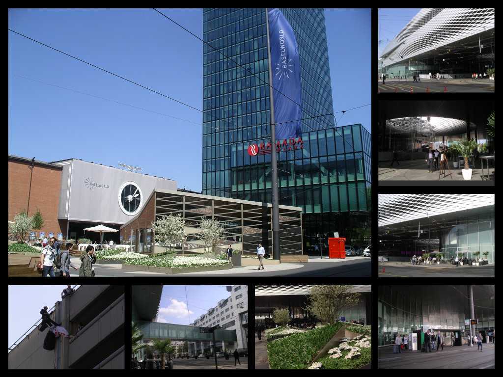 Nella foto grande il grattacielo, che svetta nella Messe Platz e l’ingresso della vecchia Halle 2, che adesso ospita orologi e gioielli. Nelle foto piccole dall’alto in basso in senso antiorario: il lato della Fiera con l’ingresso e la Halle 1; la piazza coperta con il foro per l’aerazione, un ristorante all’esterno, l’ingresso alla Halle Lounge 1 Sud, aiuole fiorite di giacinti e mughetti mentre nelle Halle i fiori del 2013 sono stati mazzi di calle bianche; la passerella coperta che unisce la Halle 1 sud alla Halle 4 e infine alcuni giovani contestatori che si sono calati dal terrazzo del parking, protestando contro l’impiego del “dirty gold” (ricordo analoghe manifestazioni anche a VicenzaOro a fine anni ’90) poi fermati dalla polizia e da segnalare l’imponente servizio d’ordine per il controllo dei passaporti di stranieri sospetti, scortati dai poliziotti sino agli uffici della fiera.