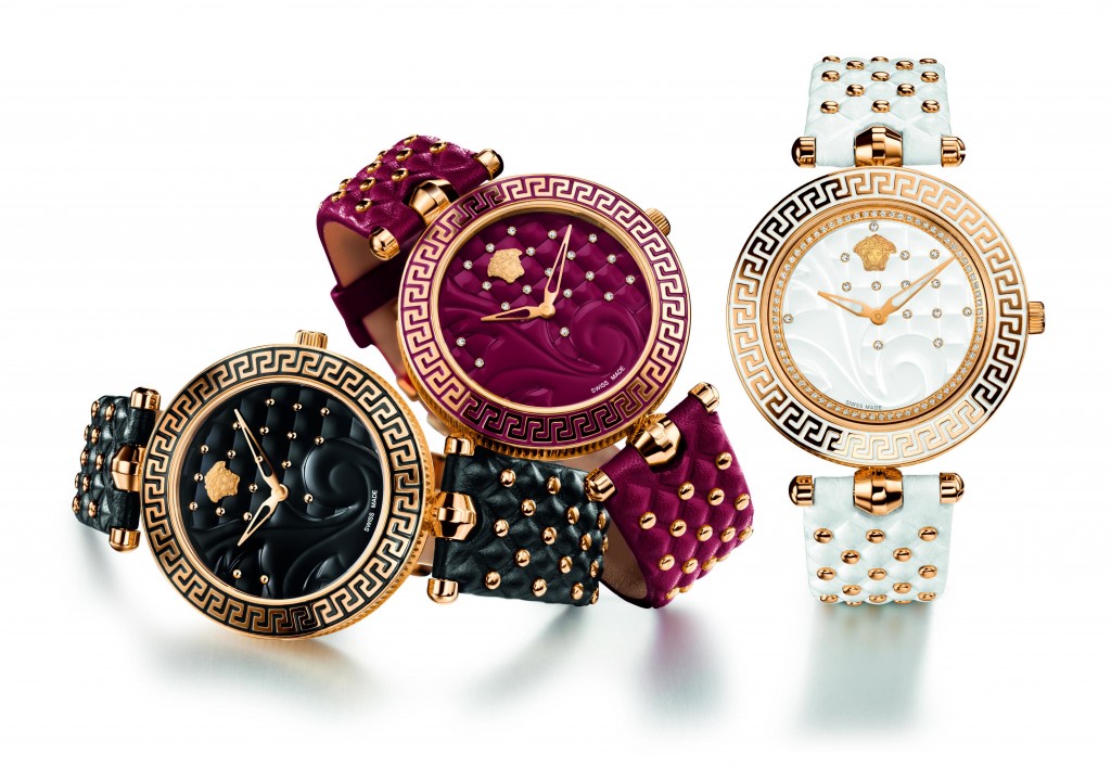 Vanitas è un nome che distingue anche una collezione completa di altri raffinati accessori Versace. Il segnatempo ideato per il Natale 2013 è realizzato in cinquanta esemplari ha la cassa in acciaio IP rose gold ø mm 40, diamanti sul réhaut e incastonati – o per usare un termine sartoriale “impunturati” – sul quadrante in smalto, cinturino in pelle con borchie e i classici decori della Medusa e della greca. Il movimento Siwss-Madre è un Ronda al quarzo.