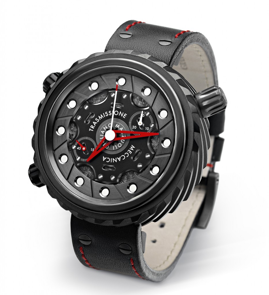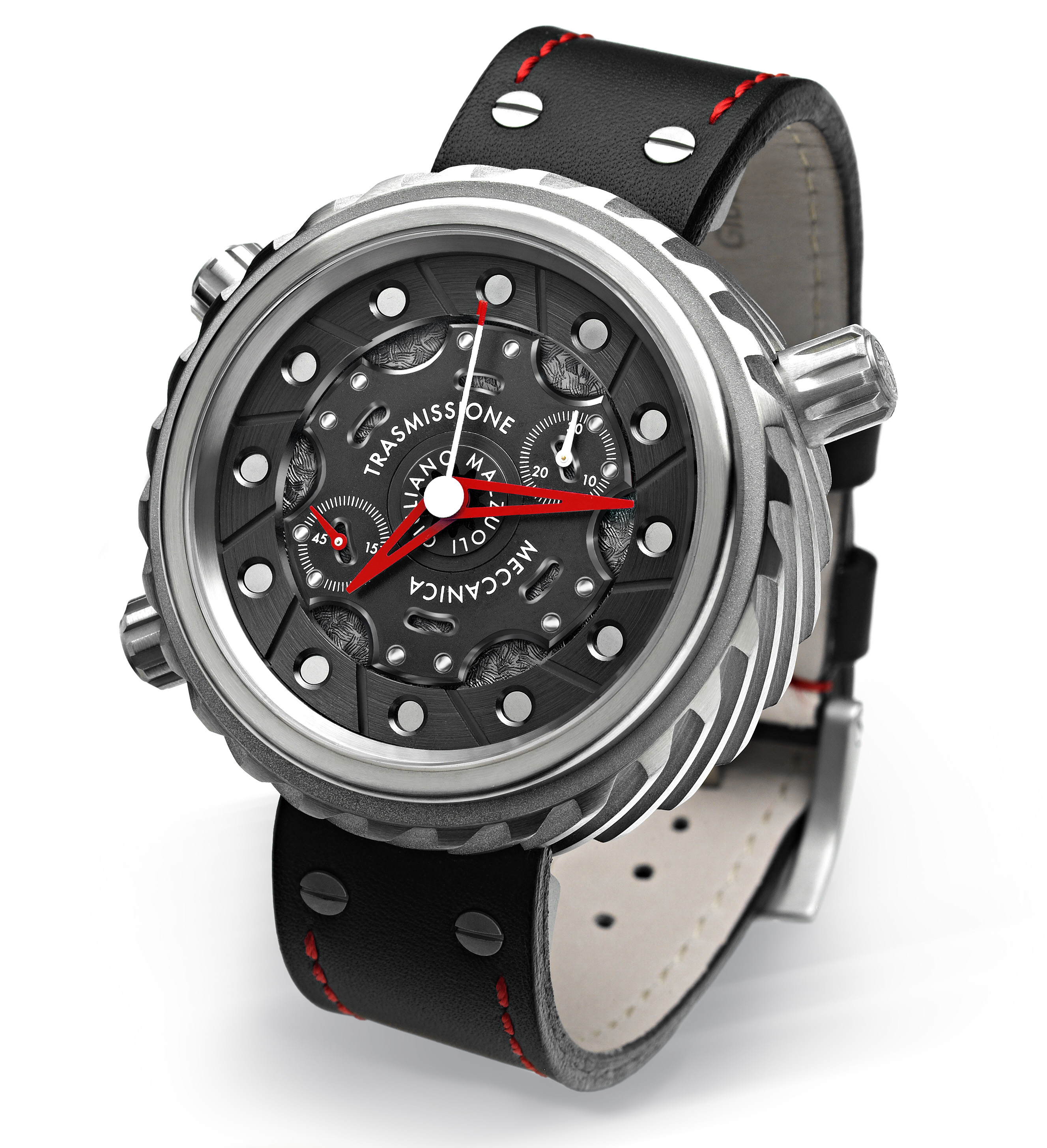 Chi segue il comparto orologiero almeno dal 2005, ha visto senza dubbio il Manometro, l’orologio da polso che nella forma ricorda l’attrezzo per misurare la pressione delle gomme (in seguito in dimensioni ridotte a mm 27, è diventato anche un moderno Tasca) o altre idee che hanno unito automobili e orologi. Come accade in questo recente cronografo della collezione Trasmissione Meccanica.