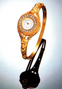 La Vacheron & Constantin a quell’epoca dava lavoro a 49 uomini, 17 donne e 4 ragazzi e tra i clienti annoverava tutto il Gotha europeo, compreso lo Zar. Con coraggio, sostenute da François Constantin e dal direttore dello stabilimento, le due signore proseguirono nella conduzione dell’impresa, che era stata fondata nel 1755 (da allora non ha mai smesso di produrre orologi). In seguito i giornali ginevrini riconobbero i meriti di Madame Catherine Etienne definendola “Simbolo dell’orologeria di Ginevra”. Nel 1896 la Vacheron & Constantin divenne una società per azioni. Nella foto in alto un orologio bangle in oro e diamanti presentato all’Esposizione Universale dal gioielliere Gustave Sandoz, senza dubbio il primo modello da polso femminile della Maison, che ne ha registrato ufficialmente uno, solo nel 1911; questo esemplare è stato messo all’asta da Antiquorum nel 1994.