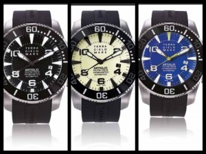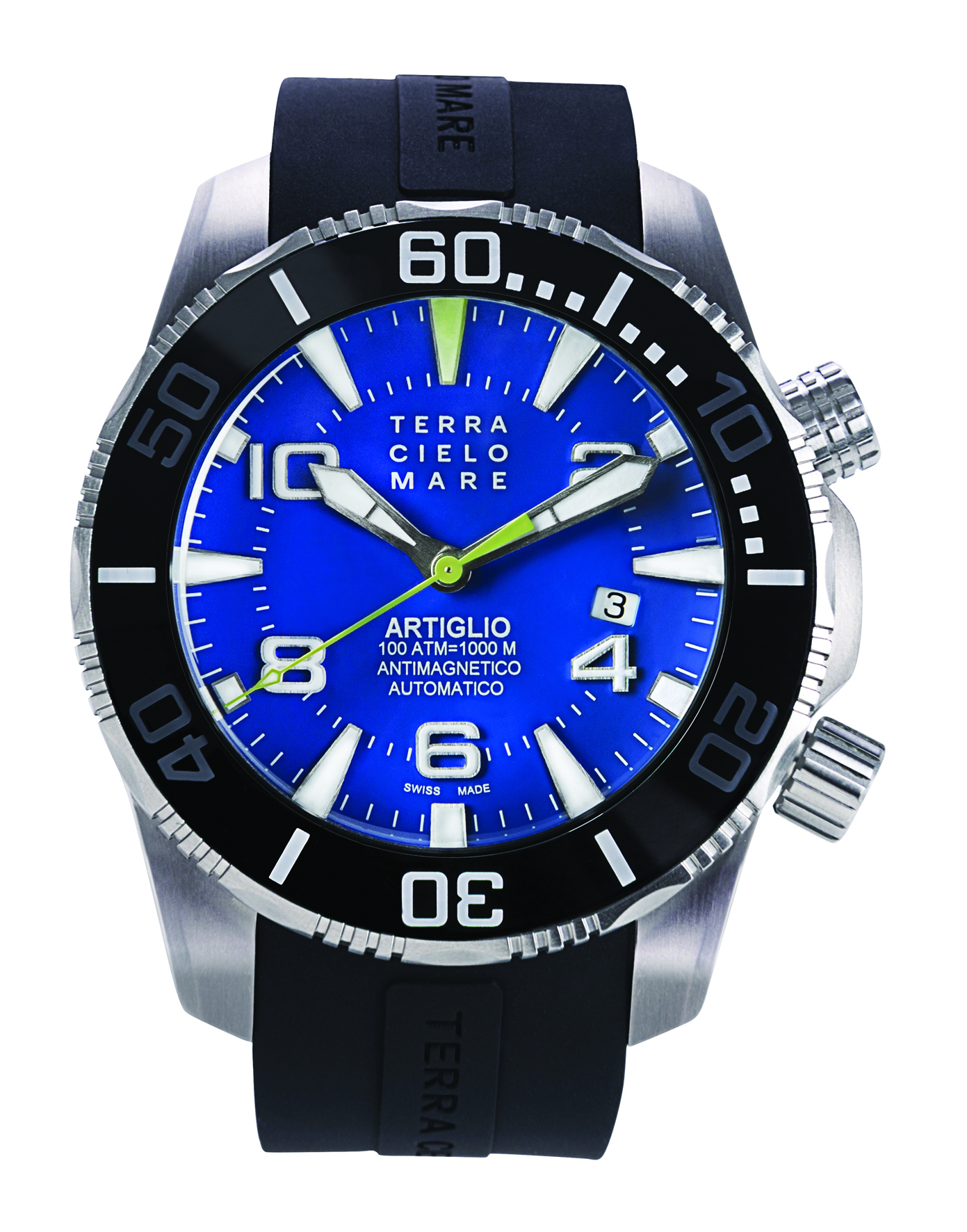 La marca italiana, tornata da poco sul mercato, fa sul serio e riprende, in termini attuali, temi sviluppati in passato. Il nuovo automatico con movimento Swiss Made, sub a 100 atmosfere (mille metri), con lunetta girevole e valvola di scarico per il gas elio, è dedicato a due navi della nostra Marina, Artiglio e Artiglio II, famose nel mondo per recuperi subacquei.