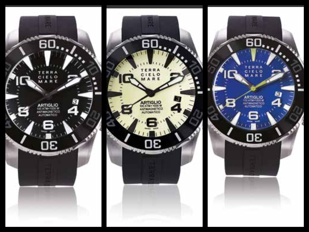 Sono passati quasi novant’anni ed ecco, sopra, i nuovi automatici subacquei dedicati all’Artiglio; queste le loro caratteristiche: cassa antimagnetica in titanio e acciaio ø mm 52, sub a 100 atmosfere e con valvola per lo scarico del gas elio, vetro a occhio di bue, quadranti blu, nero o guscio d’uovo, indici e lancette in Superluminova, cinturino in poliuretano.
