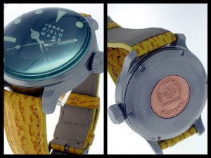 Ho anche recuperato la fotografia (sopra) del Palombaro, che nel 2005 TCM dedicò a tutti i palombari in forze sull’Artiglio II che, nel 1928, al termine della missione erra riuscito a recuperare 7 onnellate d’oro 44 di argento. Oltre a Alberto Gianni sulla nave c’erano infatti anche Aristide Franceschi e Alberto Bargellini; l’orologio dedicato a questi coraggiosi era un automatico sub a 20 atmosfere, movimento ETA 2824/2, cassa ø 44 mm con corona a vite, vetro bombato di mm 9; sul quadrante e sul medaglione in bronzo del fondello recava il simbolo dei palombari il casco dello scafandro. Cinturino giallo sia in squalo sia in caucciù.