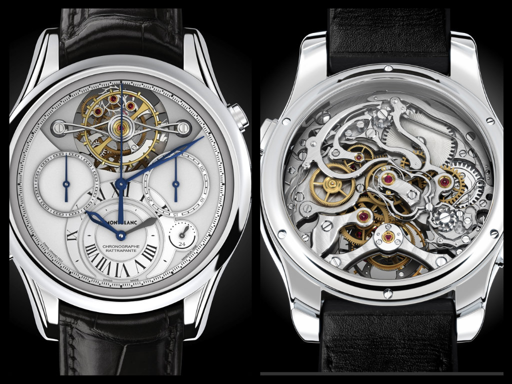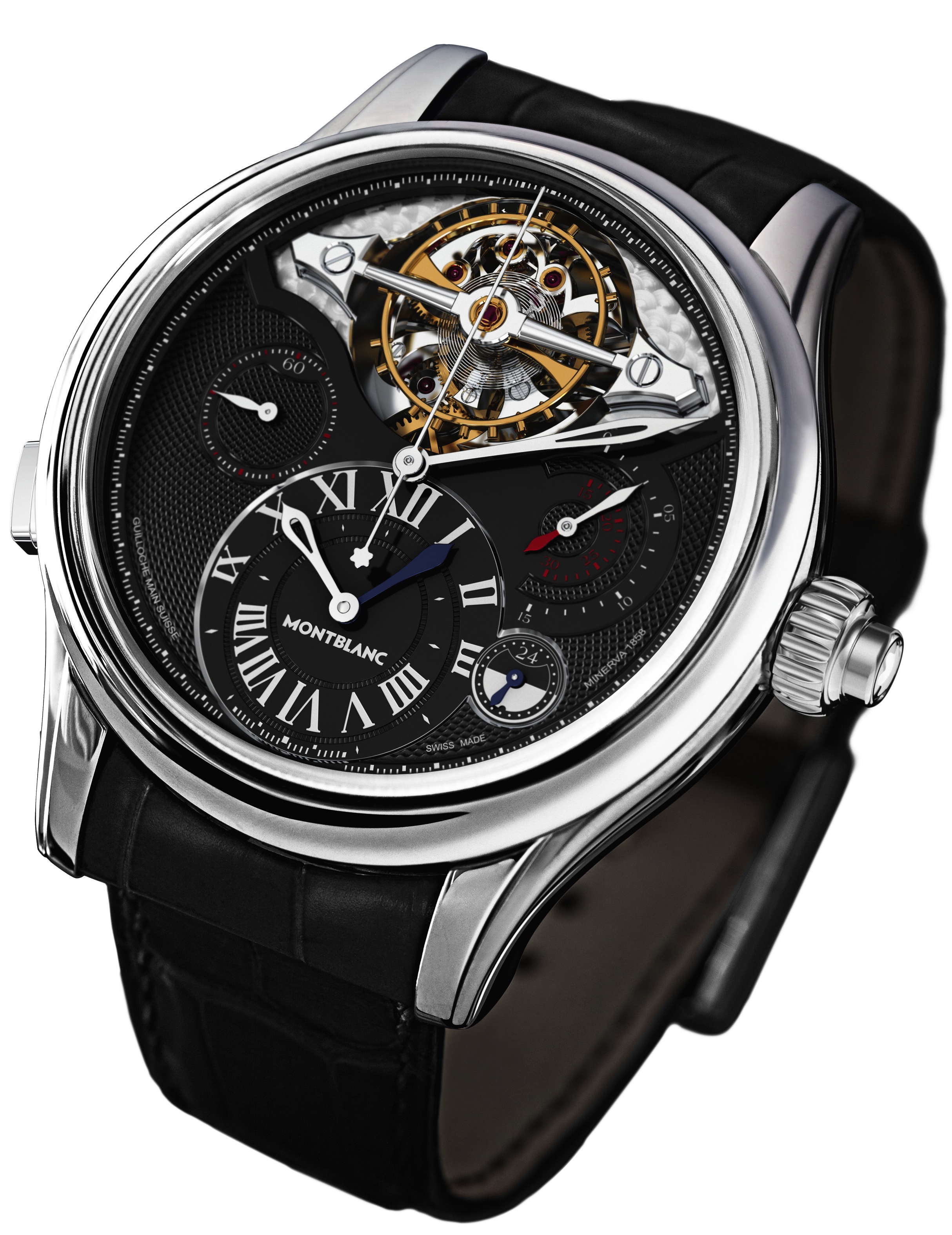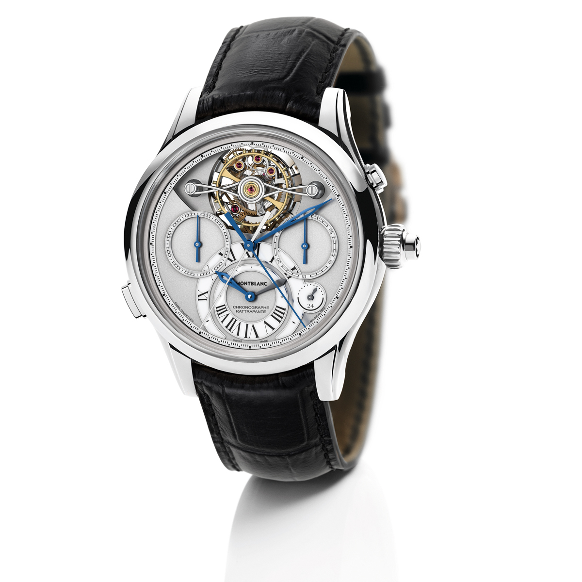 Nel 2009 al Salone dell’Alta Orologeria di Ginevra Montblanc, nella collezione Villeret 1858, aveva presentato il Grand Tourbillon Heures Mysterieuse che l’anno dopo aveva dato origine all’Exo Tourbillon, realizzato in otto esemplari dal team guidato da Demetrio Cabiddu. In una cassa in platino o in oro rosso o bianco, ø mm 47, era arricchito dalla complicazione cronografica e da un secondo fuso orario con indicazione giorno-notte, ma soprattutto aveva una curiosa particolarità, il bilanciere all’esterno della gabbia del tourbillon. In questo modo si evitava di distribuire l’inerzia della gabbia del tourbillon sul bilanciere, uno degli esperimenti per migliorare la precisione nell’indicazione del tempo e che all’azienda era costato oltre tre anni di studi ed esperimenti. Il Calibro MB-M16.60 riuniva 341 componenti, aveva 32 rubini, 18.000 A/h; queste le dimensioni del bilanciere: Ø 14.5 mm; 59 mgcm2.