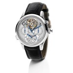 Sono passati tre anni e l’Exo Tourbillon torna mantenendo le caratteristiche iniziali, è sempre un monopulsante coassiale alla corona di carica, ma con un’ulteriore complicazione cronografica: la lancetta rattrappante per vedere due tempi rapidi in successione, comandata dal pulsante a ore 2, mentre il pulsante alle 8 regola il secondo fuso orario. Il movimento a carica manuale è il Calibro 16.61 che riunisce 411 componenti, ha 18.00 A/h, due ruote a colonne e una doppia pinza frenante, quella che in Italia viene comunemente chiamata “scarabeo” e in effetti la sua forma lo ricorda, le “antenne” della seconda servono per bloccare la ruota secondi del rattrappante. La riserva di carica è di 55 ore, gli esemplari previsti nella cassa in oro bianco sono 18.