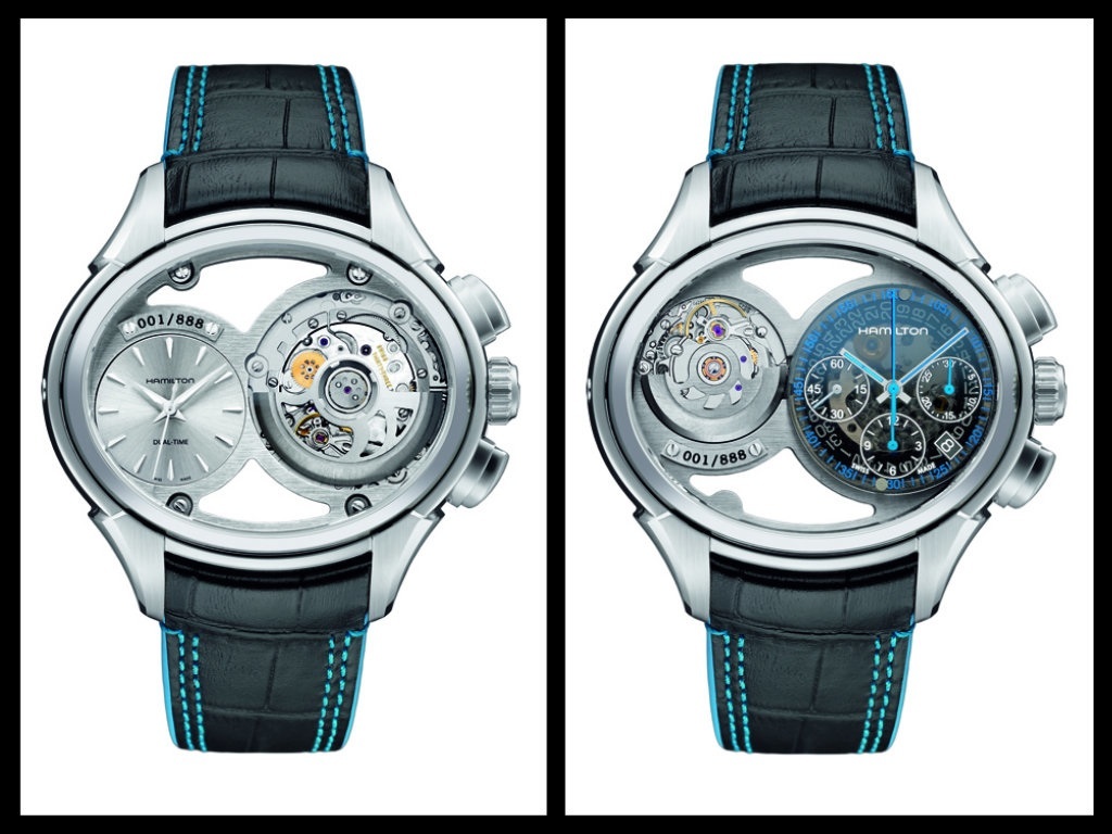 Quest’anno Hamilton presenta il Jazzmaster Face2face: da un lato segnatempo con movimento automatico ETA 2094, dall’altro cronografo con movimento ETA 2671; la cassa ovale girevole – mm 44×53 – è in acciaio; solo 888 gli esemplari. Per i polsi femminili c’è il più semplice Jazzmaster Lady automatico.