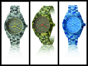 Velvety Camouflage (foto sopra) solo tempo in resistente materiale plastico che, unito al silicone, crea un effetto vellutato, nelle tinte verde militare, grigio o azzurro; cassa ø mm 41, quadrante guilloché, bracciale.