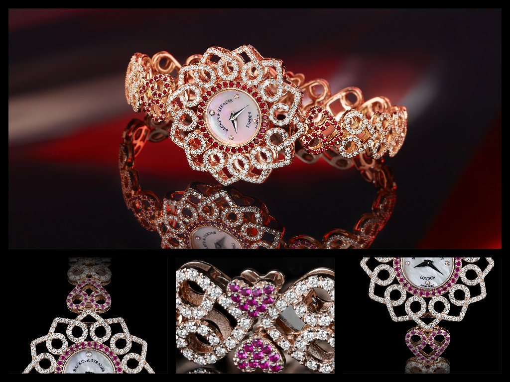 La cassa in oro bianco incastona 180 diamanti con taglio Ideal-Cut (57 faccette su ogni pietra) per un totale di 1,50 carati mentre i rubini sono 32 per un totale di o,45 carati. Prezioso anche il bracciale che incastona 322 diamanti (2,20 carati) e 66 rubini (o,60 carati). Infine sul quadrante in madreperla quattro diamanti sono incastonati al posto di quattro indici.
