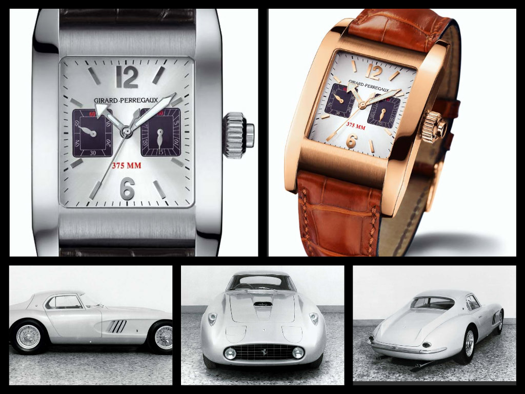 Per esempio nel 1998 i cronografi “Girard-Perregaux pour Ferrari” ebbero nuovi quadranti in fibra di carbonio e furono definiti “d’annata” recando la sigla F300. Passarono alcuni anni e nel terzo millennio l’ispirazione arrivò dalla 375 Mille Miglia, una vettura testimone di un grande amore. Nel 1954 infatti Roberto Rossellini ordinò una Ferrari speciale per Ingrid Bergman che amava il grigio e in questo colore fu realizzata la 375 Mille Miglia, esemplare unico firmato Ferrari-Pininfarina; da allora la gamma cromatica delle Ferrari si arricchì del “grigio Ingrid”. L’elegante cronografo rettangolare monopulsante (in oro rosa o bianco e quadrante grigio; movimento con ruota a colonne) realizzato in 375 esemplari, fu presentato nel 2002 a New York durante una serata di gala.