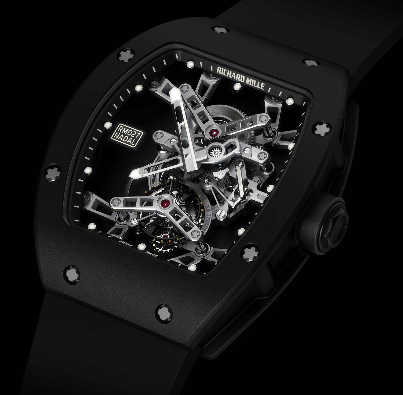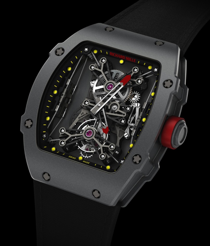 Nel 2009 Richard Mille aveva realizzato un tourbillon molto leggero per Felipe Massa che lo aveva al polso durante l’incidente al G.P.di Ungheria. Nel 2010 presentò un altro modello (previsto in 50 esemplari) che, cinturino compreso pesava 20 g. Cassa mm 39,70×48, lunetta e rehaut del quadrante erano a base di carbonio, movimento in titanio e Lital. Sul quadrante (foto sotto) il nome del tennista al quale era dedicato. In allenamento Nadal lo mise nell’armadietto di un club e la notizia del furto fece il giro del mondo. La Maison però gliene fornì subito un altro.