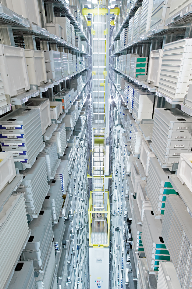 I due magazzini di stoccaggio dei componenti sono altri 12 metri, al loro interno hanno binari lunghi un chilometro e mezzo e 24 stazioni smistano oltre 60.000 articoli facendoli arrivare in pochi minuti ai banchi degli orologiai che li hanno richiesti.