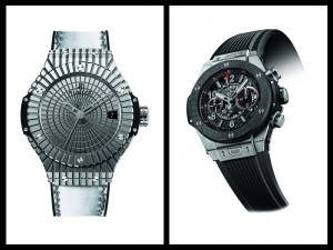 Non così esclusivi (a prescindere dai prezzi non alla portata di molti appassionati) altri orologi che rappresentano delle novità anche se ruotano intorno alla cassa dei King Power e al concetto prediletto da Jean-Claude Biver, l’Arte Fusion. Nella foto sopra il Big Bang Caviar con la cassa in acciaio ø mm 41 e 36 diamanti incastonati sulla lunetta e il Big Bang Unico, del quale si è già parlato l’anno scorso per il suo movimento, ideato e sviluppato in house. Rappresenta infatti una nuova filosofia della Marca, che semplifica la produzione automatizzandola. Oggi sono disponibili le prime 4 Referenze di questo cronografo flyback con ruota a colonne a doppio accoppiamento, visibile dal quadrante e cassa ø mm 45,5 in titanio o King Gold, con inserti in resina composita nera. Il quadrante è scheletrato e per la prima volta da Hublot i pulsanti sono rotondi.
