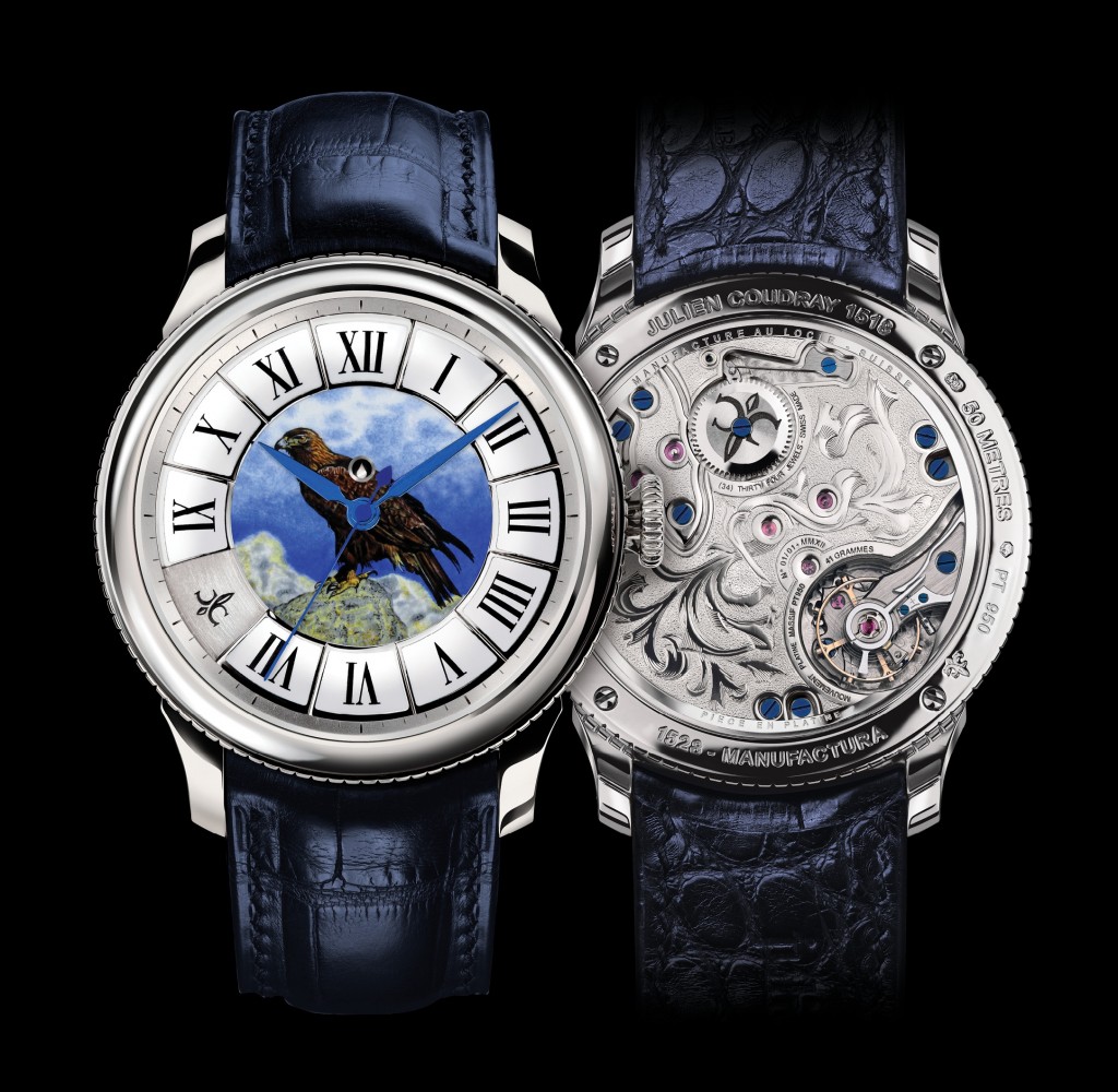 A Le Locle infatti la Manifattura produce orologi unici come “L’Aigle Royal” della Collezione Les Oiseaux, foto sopra, con cassa (ø mm 39) e movimento meccanico in platino protetti da numerosi brevetti di fabbricazione. Composto da 13 parti il quadrante ha una fascia in oro bianco grand-feu e indici a cartouche. La spia di servizio, al centro, mostra quando al meccanismo, che ha funzionato per 4 anni, occorre una goccia di olio. La miniatura centrale in smalto è dipinta “point by point”, tecnica del XVII secolo. Lancette azzurrate, colori ottenuti senza l’aiuto di agenti chimici.