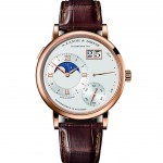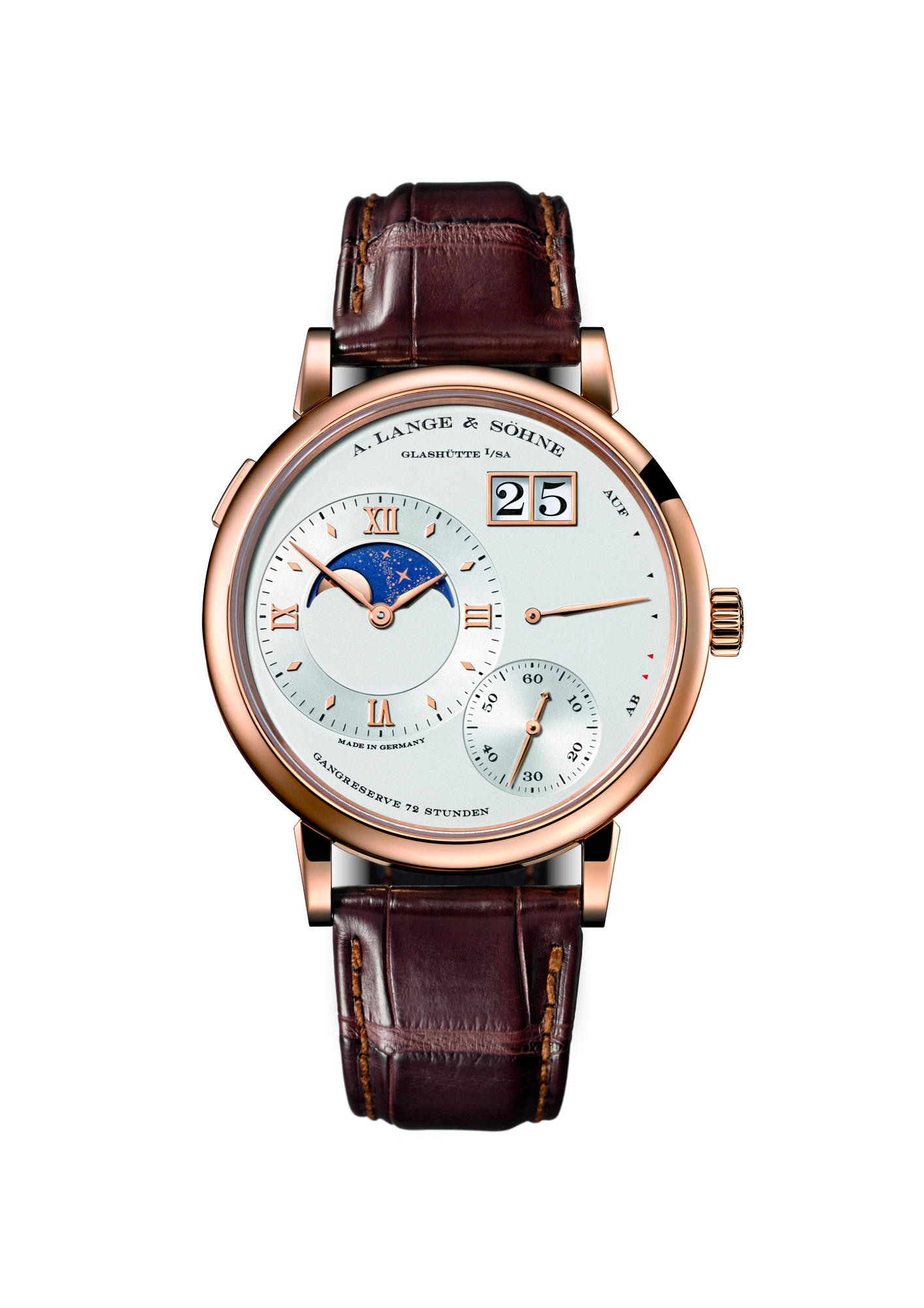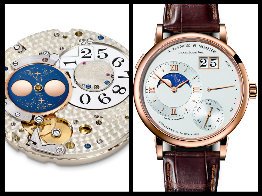 Meno facile calcolare il ciclo della luna sul quadrante di un orologio. L’intervallo fra un plenilunio e l’altro è stato calcolato con precisione al 99,9978%; il periodo medio è 29 giorni 12 ore 44 minuti 3 secondi e per comodità lo si è arrotondato a 29,5 giorni. Però a voler essere precisi se si somma lo scarto di 44 minuti e 3 secondi per ciclo dopo due anni e mezzo si raggiunge un giorno. Il sistema brevettato da A.Lange&Söhne, con ingranaggio a sette scatti collegato al moto continuo della ruota delle ore, riduce lo scarto a meno di un minuto. Dopo la prima regolazione, con orologio ininterrottamente a piena carica, la nuova regolazione, con il pulsante nella carrure fra le 7 e le 8, sarà necessaria dopo 122,6 anni. Al disco della luna fanno contorno 300 stelle tagliate a laser; tramite un procedimento speciale durante la luce diurna le componenti cromatiche non blu sono assorbite cosicché il cielo è sempre di un blu intenso.