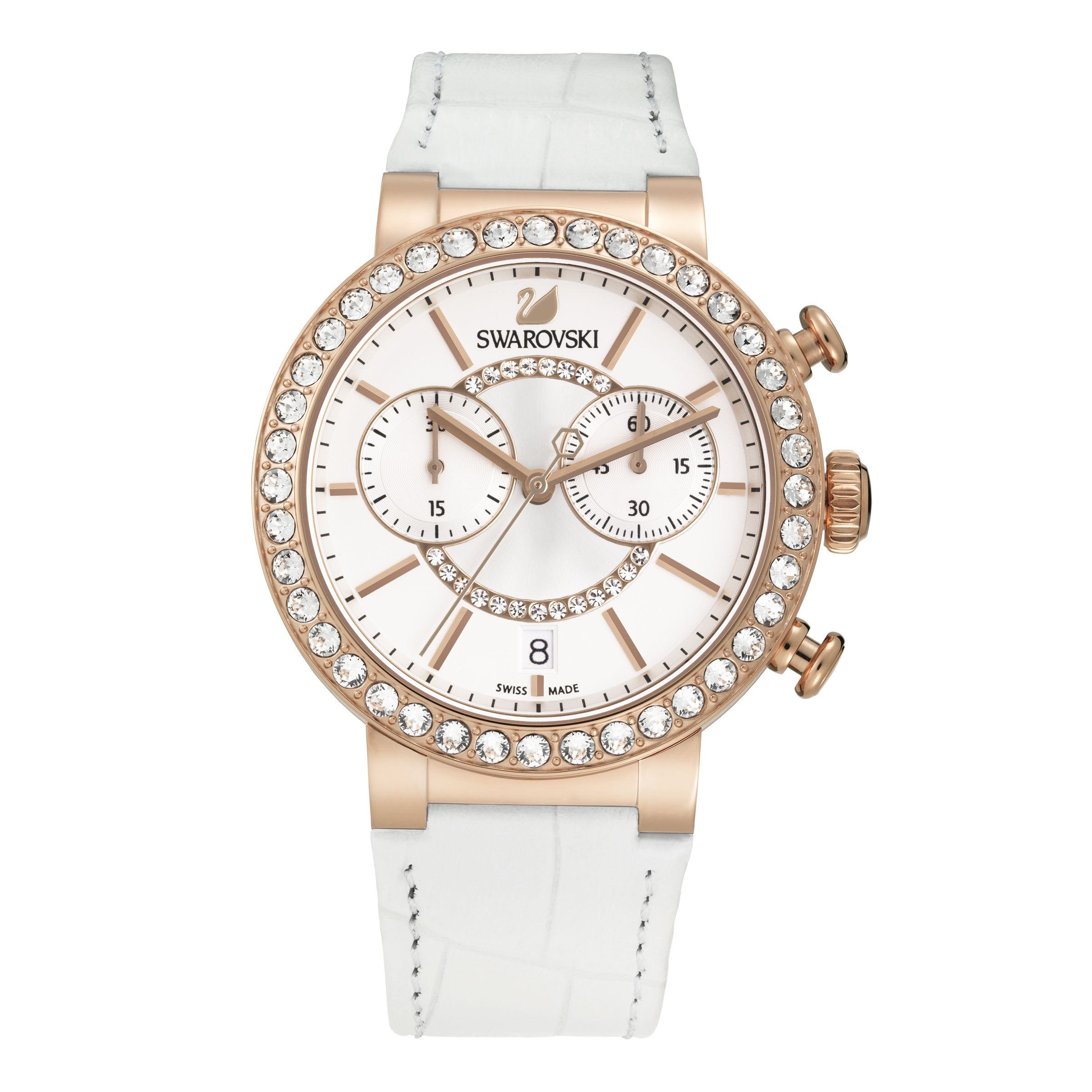 Mancano più di tre mesi a Baselworld 2014, ma c’è già un’anticipazione Swarovski e proprio nella collezione Citra. Infatti è stato annunciato l’arrivo di un cronografo (il secondo destinato ai polsi femminili) che darà un tocco di sportività alla collezione, pur mantenendone il look elegante. La cassa ø mm 38, in acciaio inossidabile e placcata oro rosa, ha la lunetta scintillante per 40 cristalli trasparenti, che illuminano con motivo circolare pavé anche il quadrante silver con motivo a raggi di sole; gli undici indici sono rappresentati geometricamente dai cristalli, al posto del 12° il logo del cigno; sul fondello il motivo Swanflower®, sulla corona cabochon e logo che la personalizza; cinturino in pelle bianca stampa coccodrillo, fibbia ad ardiglione, trattata PVD oro rosa; movimento al quarzo Swiss Made.